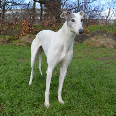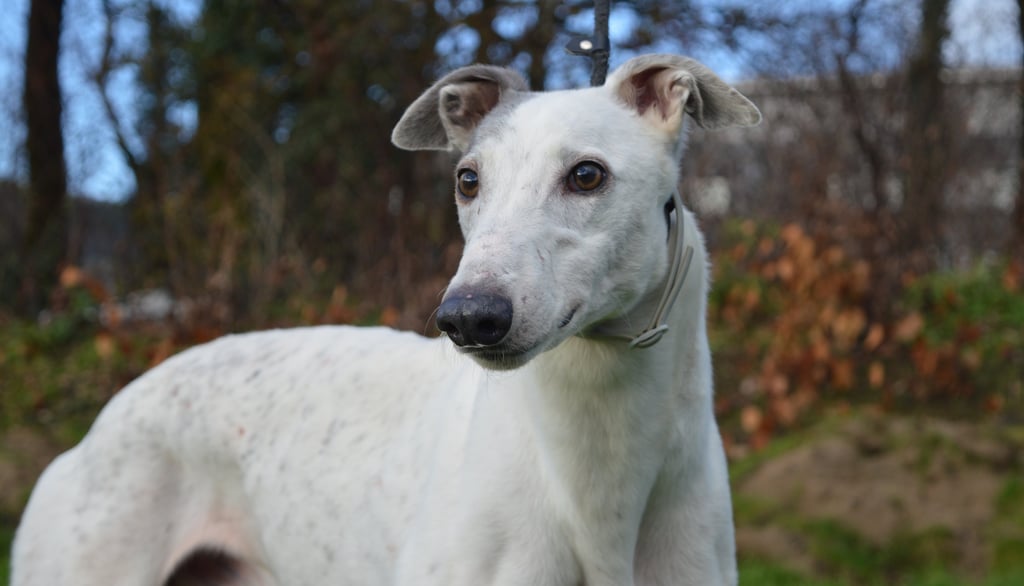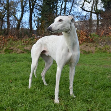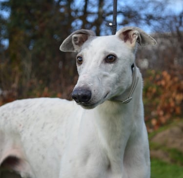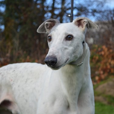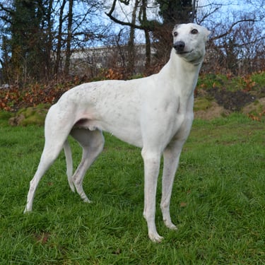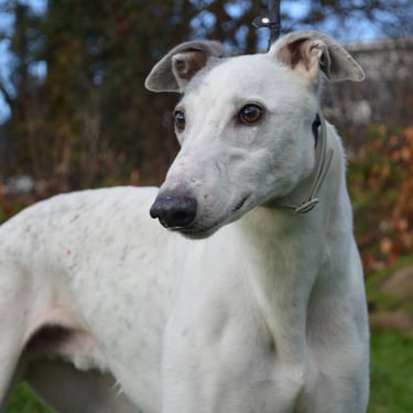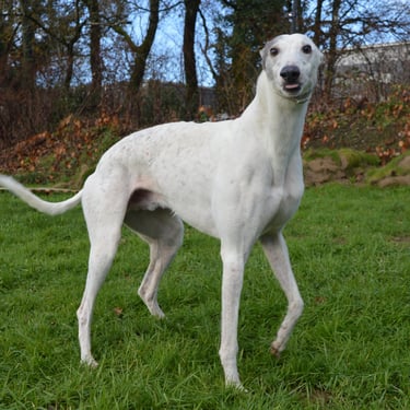 A big, beautiful white greyhound with a striking blue patch on his face that makes him look like he's always ready for a photoshoot. Syd may be a large lad but he's really just a soft loving marshmallow in dog form.